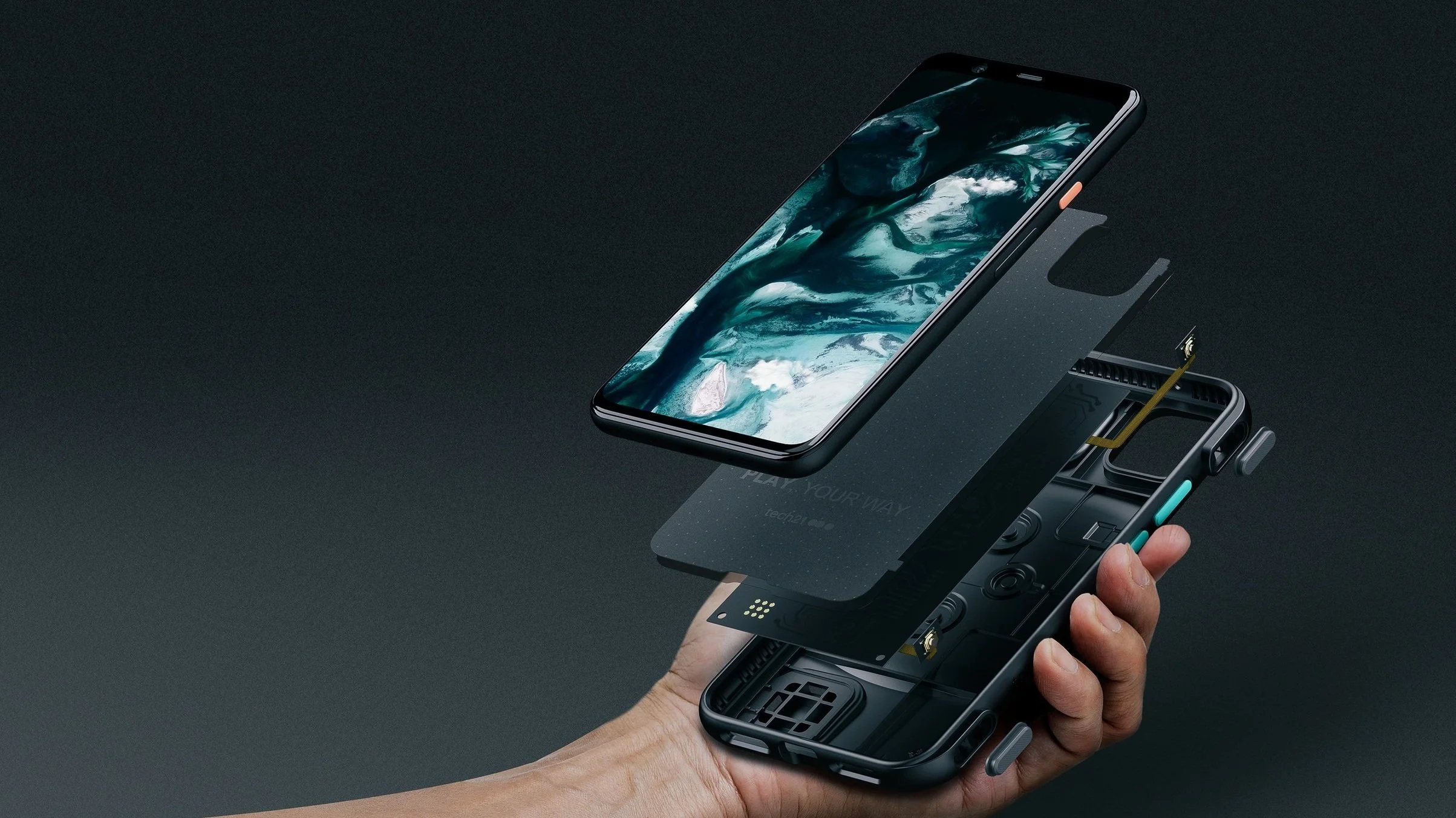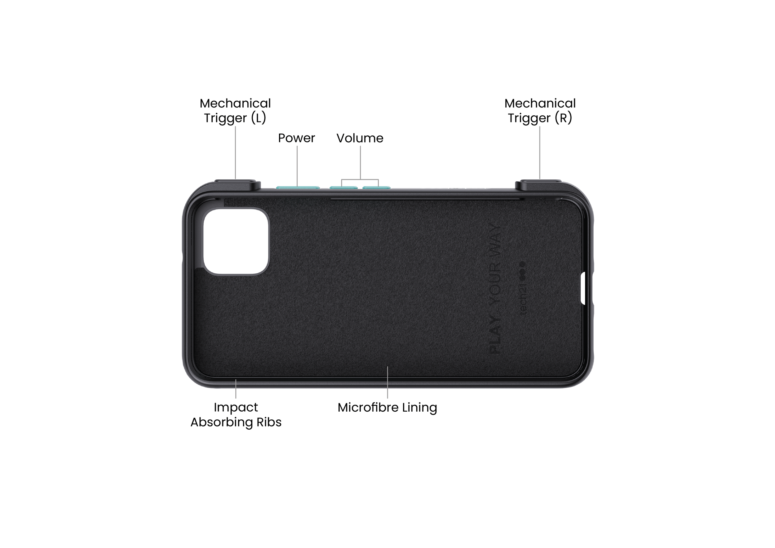 The “Everday” gaming case added the additional functionality of mechanical triggers and mappable rear buttons. A layered TPU & Polycarbonate frame ensure a high level of impact protection, despite the delicate electronics housed inside. The on/off button ensures that the case only draws power from the device via NFC when the user is actively playing.
